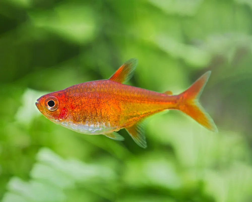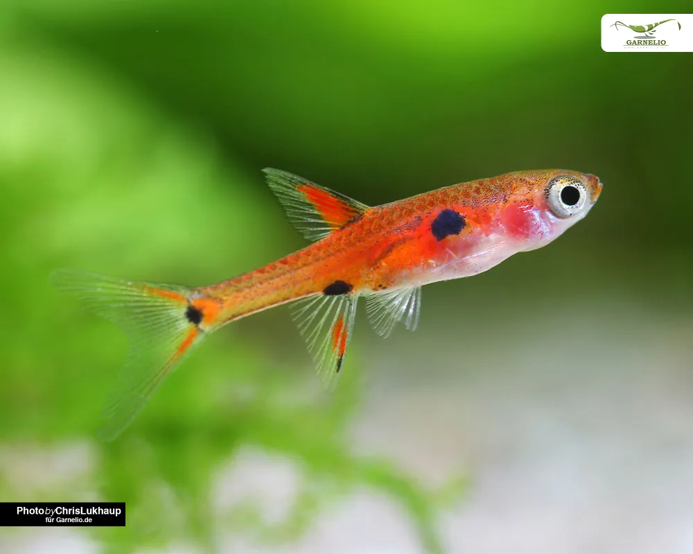 These spots appear orange or red, however they can be difficult to see on the body of Scarlet Badis because of their orange body color.