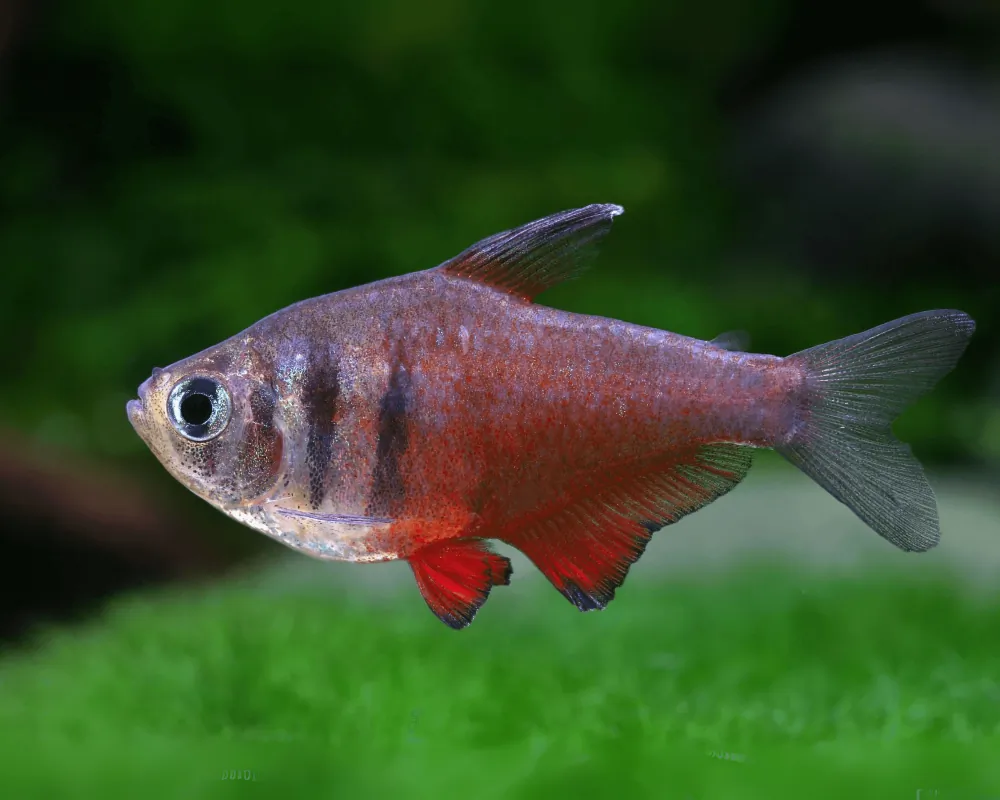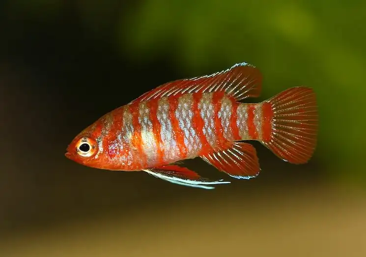 - Scarlet Badis (Dario dario): Males are bright orange/vibrant red with 7 pale silvery-blue vertical bands beginning from the start of the dorsal fin, continuing onto the fins. As they mature their pelvic, dorsal and anal fins are highlighted in blue. There are 8½ scales present in the transverse row and distinct lines on the supraorbital region.