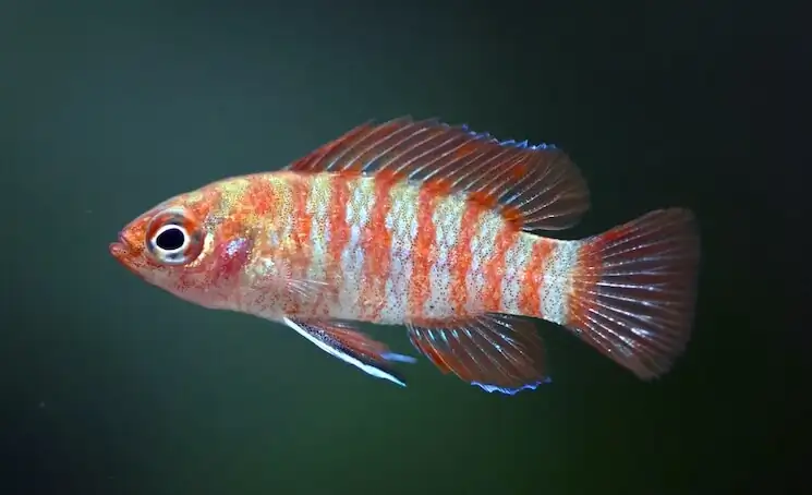 Males feature 7 dark vertical bars across sides with bold red coloration, while females exhibit uniform grayish coloration or indistinct vertical bars. Breathtaking coloration and activity peaks during spawning, with rival males "facing off" or "dancing" alone for a female's attention.
