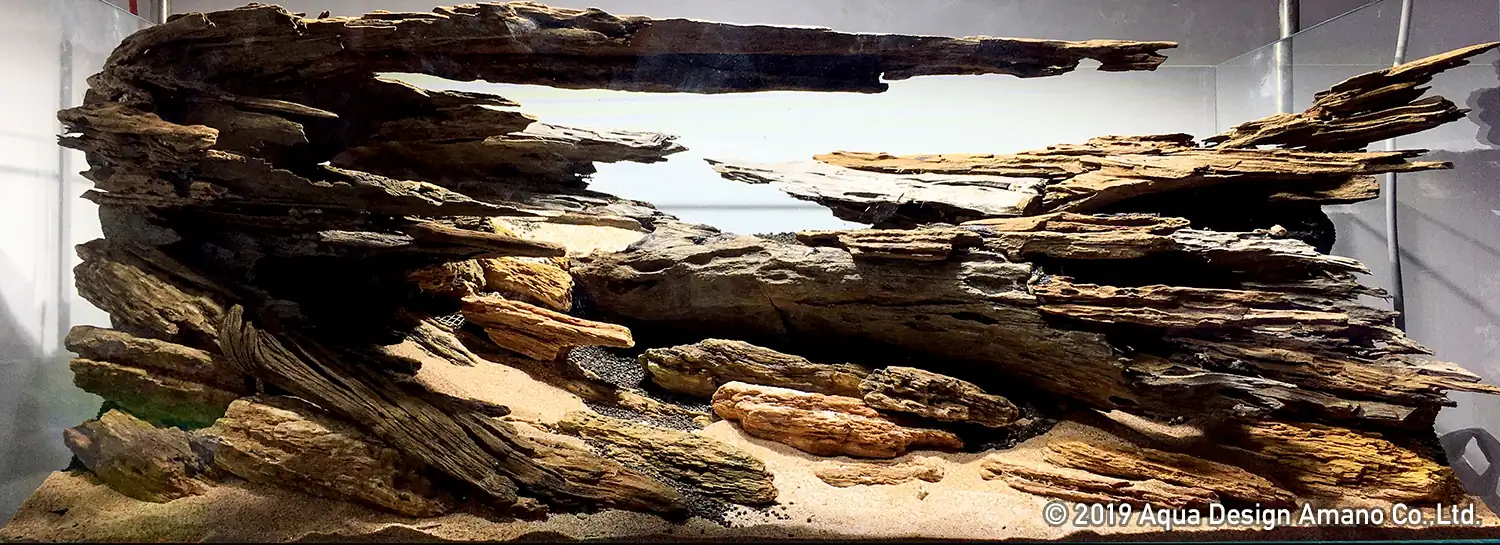 Mr. Yeo Siak Wee (Malaysia) is ranked 5th (Bronze prize) with his "Fallowness." The layout was highly regarded, receiving more than 200 points from each of the three judges; Mr. Andre Longarco (Brazil), Mr. Friedrich Bitter (Germany) and Mr. Sergei Kochetov (Russia). Although aquascapes are created largely in a vertical manner, this layout is cleverly composed with a horizontal empha- sis that makes it unique and different from others. This layout stands out among many other contest submissions, which are aiming mostly at making a great visual impact, because while gen- erating such an impact it simply creates a natural atmosphere with wonderful planting details, which reduce sharpness of the layout. The color and texture of foreground rocks were selected to match those of the driftwood, and on top of it, Mr. Yeo tactfully selected fish of similar color. The photo was captured at the perfect moment in view of plant growth and fish positioning.