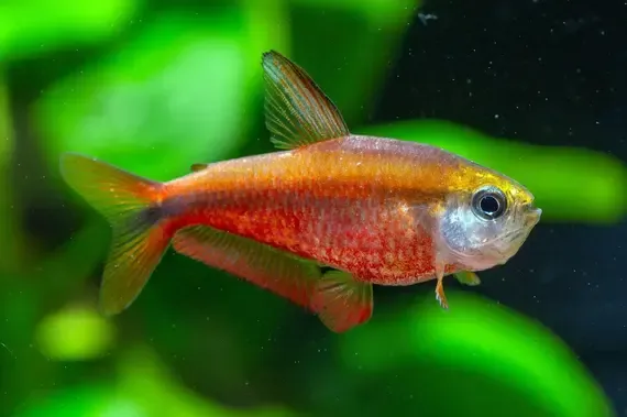 The Red Emperor Tetra is hailed as one of the most "personable" Tetra species. Mature males boast a regal color scheme: a smoky purple or gray body punctuated by bold stripes of ruby red or deep wine-red. Their signature feature is the majestic trident-shaped caudal fin and powerful iridescent blue eyes, giving them a commanding presence as they patrol their aquatic kingdom. This fish is a perfect choice if you desire a peaceful yet eye-catching species suitable for cohabitation in a large, planted tank.